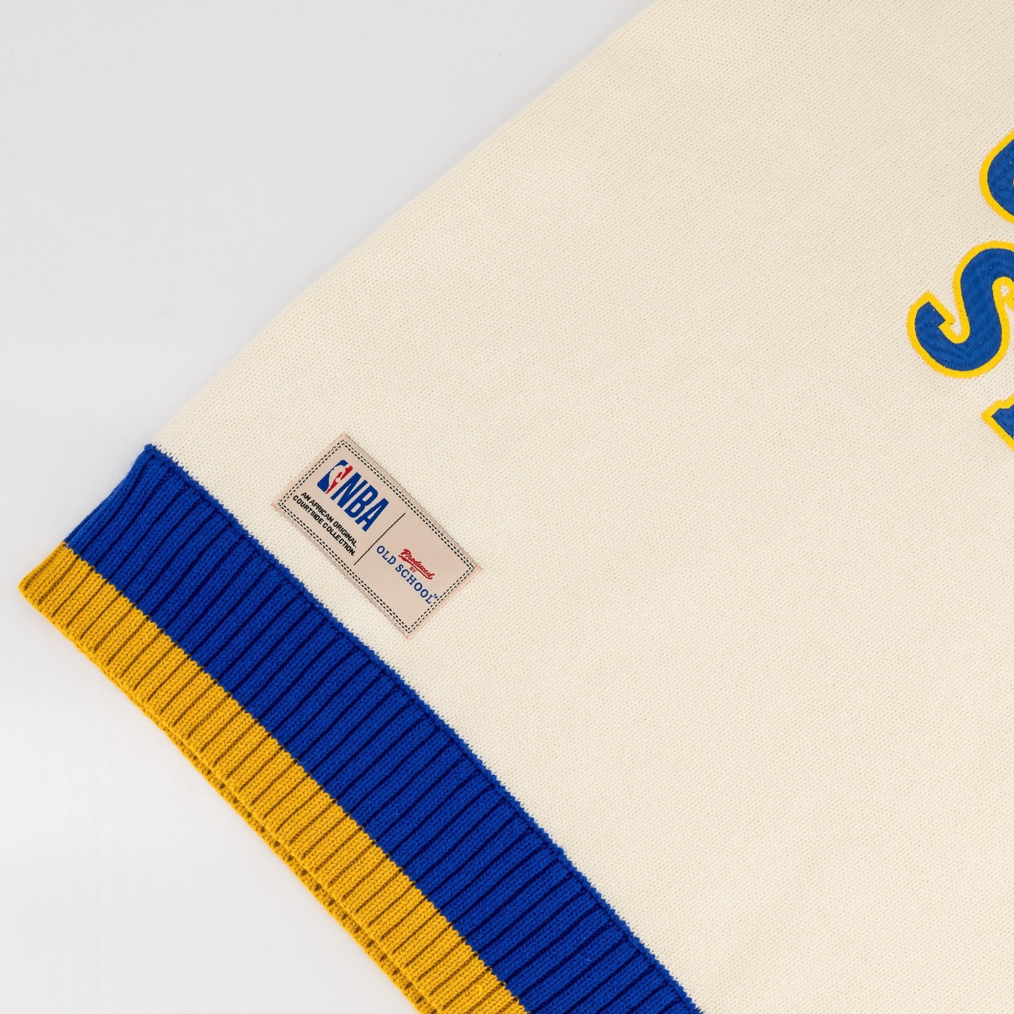 The Golden State Warriors Knitwear Vest is crafted in heavyweight cotton with a clean ivory base, finished with bold Turkish blue and golden rod contrast trims. Featuring classic varsity-style Golden State embroidery and heritage NBA detailing, this piece delivers confident courtside style with premium knit construction.